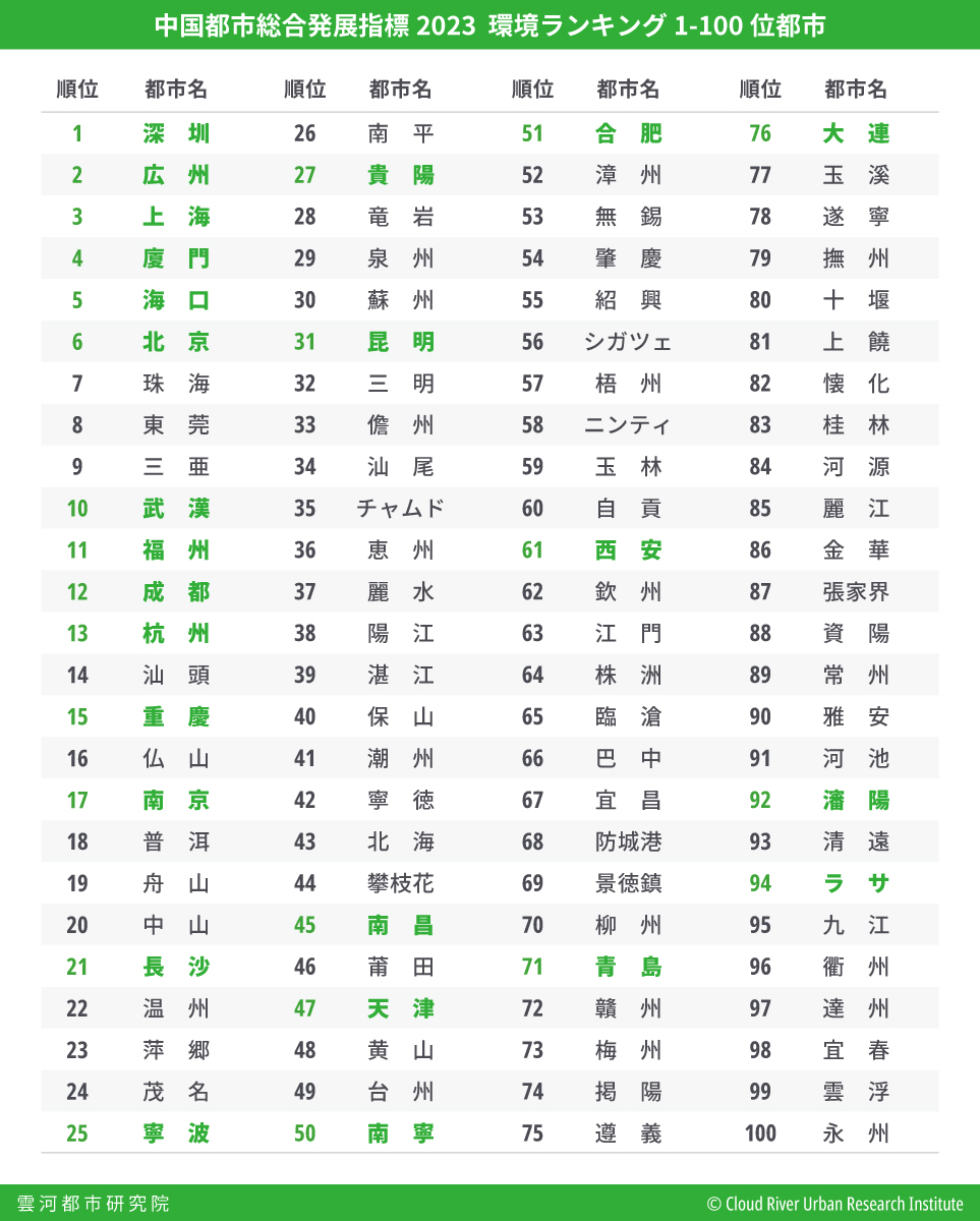 〈中国都市総合発展指標2023〉環境大項目ランキングの上位10都市は、深圳、広州、上海、廈門、海口、北京、珠海、東莞、三亜、武漢であった。