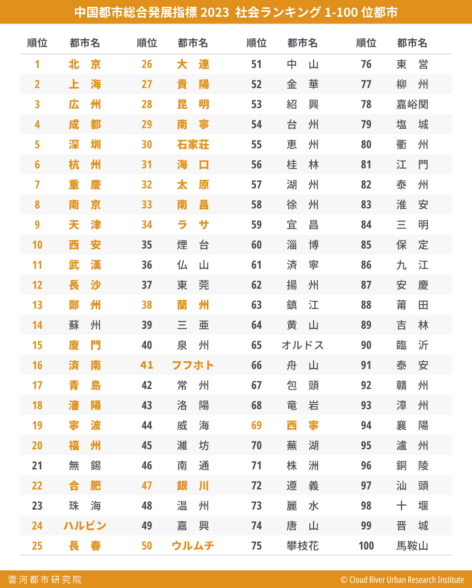 〈中国都市総合発展指標2023〉の社会大項目ランキング上位10都市は、北京、上海、広州、成都、深圳、杭州、重慶、南京、天津、西安となっている。