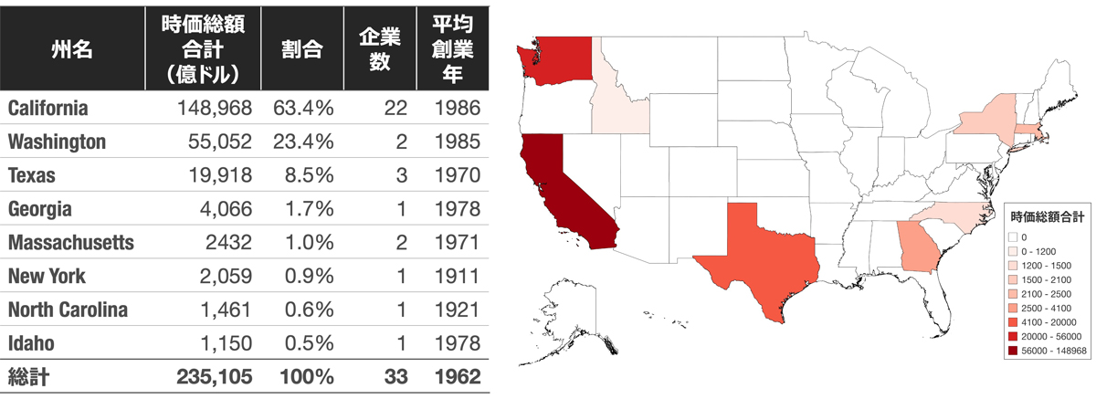 図5 米国:時価総額トップ100企業における6大「ムーアの法則駆動産業」の企業立地分布(2025)
