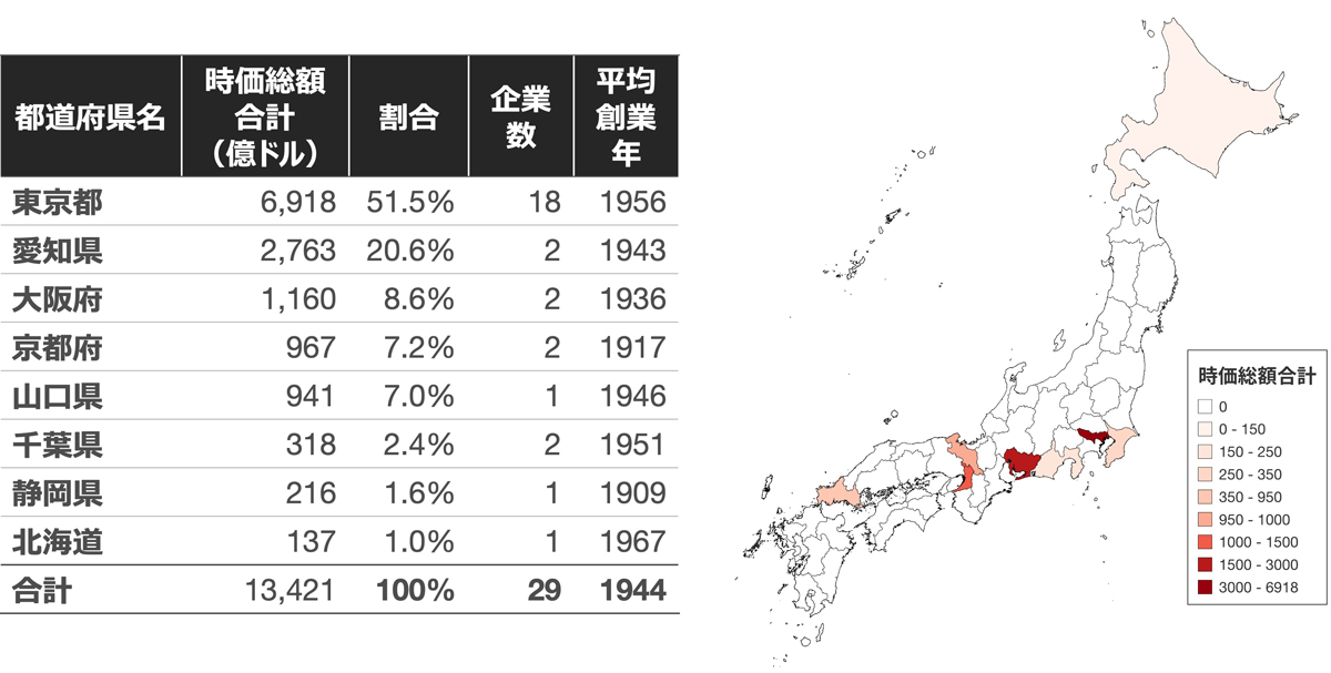 結果、図7が示すように2025年日本時価総額トップ100企業における6大産業29社の中で、22社が東京、愛知、大阪に集中している。時価総額で見ると、これら6大産業の80.1%が、上述の旧産業地帯に集まっている。空間的に既得利益集団の支配や旧態依然の発想から逃れ難いことが、テック時代の新産業をなかなか育成できない一因かもしれない。