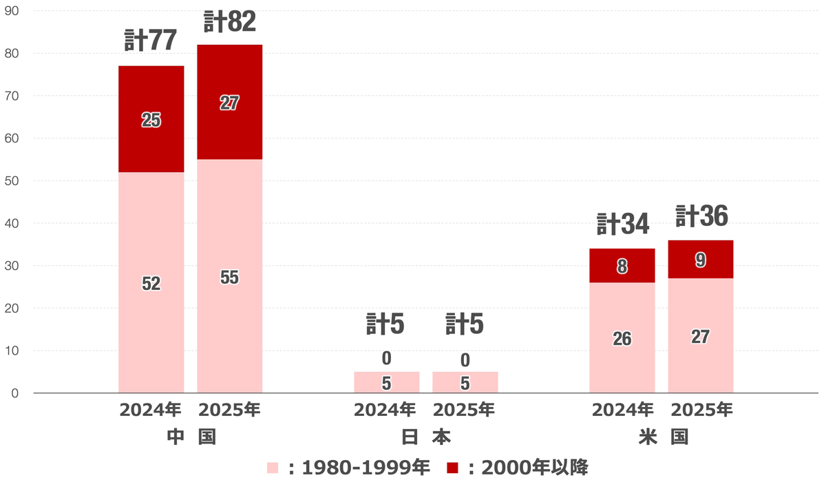 図2 日米中時価総額トップ100における1980年以降に創業した企業数(2025)