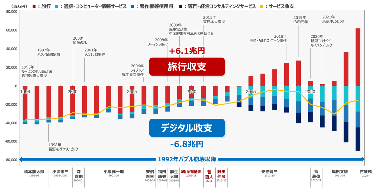 図3 日本のデジタル赤字はインバウンドの潤いを相殺(1999-2024)