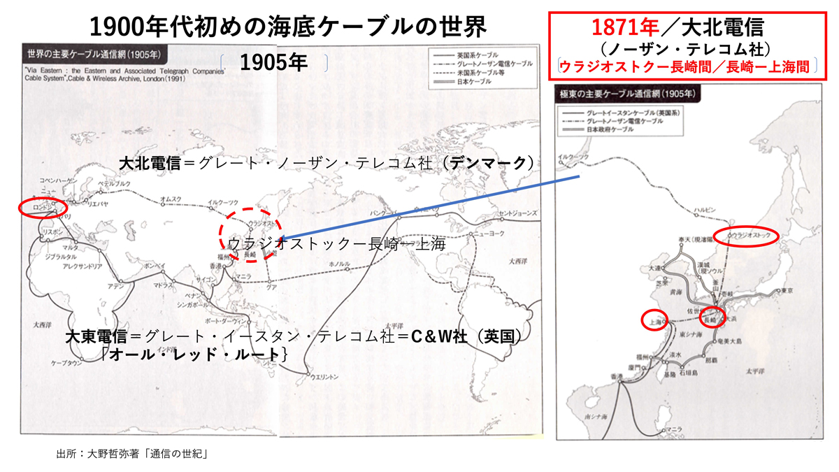 鈴木: 日本の通信事始めを言うと、電線導線1本で昔の電報のような信号送りが最初にできたのは明治2年、1869年だ。 そこで東京-横浜間で電信網が出来た。その翌翌年、1871年、明治4年、明治政府になってからウラジオストックー長崎―上海まで海底ケーブルができた。ノーザンテレコム社というデンマークの会社が引いた。日本はまだ東京―横浜間ぐらいしかできていなかった。 彼らは国際通信網で、長崎とウラジオストックを結んだ。それは、南回りの回線をイギリスのグレートイースタンテレコム社、オールレッドルートにイギリスが情報網を引いたことに対抗した。ドイツやロシアがこれを承認し自分がアジアに対して通信網を持たなければいけないとしてデンマークの会社がやった。