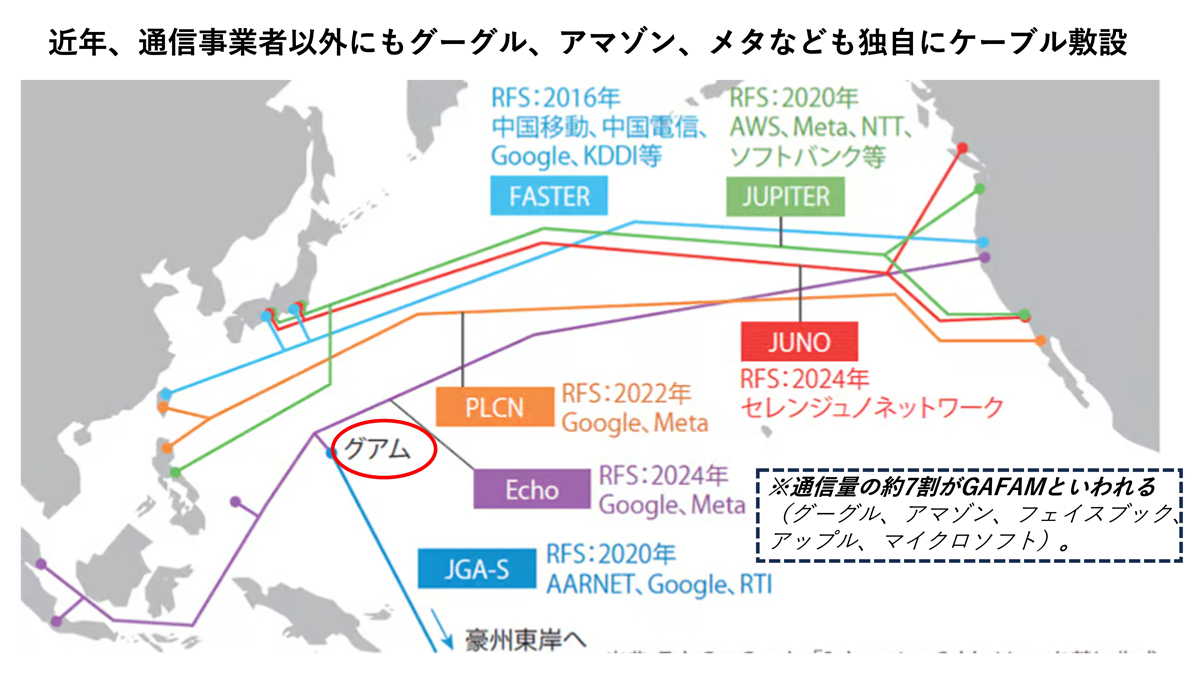 1980年以降どんどん海底ケーブルが増えてきた。現在、太平洋に光ケーブルが入っていて、いま通信業をやっている人たちにはNTT、ソフトバンク、KDDIなどの通信会社があるが、一番多いのグーグル、アマゾン、フェイスブック、アップル、マイクロソフトなどいわゆるガーファム(GAFAM)の会社だ。彼らが独自に海底ケーブルを使う。太平洋の海底ケーブルの7割はガーファムが使っている。