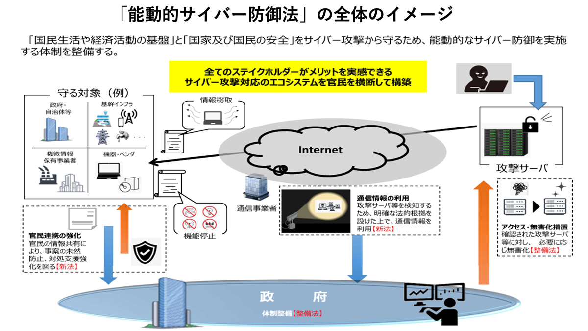 能動的サイバー防御法、アクティブサイバーディフェンス(Active Cyber Defense: ACD)の法律が今年成立した。早く攻撃を受けた発生源を先制的に止めに入り、そのための通信管理を行うものだ。国内通信は対象外だ。サイバー犯罪の99%は国外から来ているからだ。外から日本に、日本から外に行く、あるいは日本をホップして外から日本、日本からまた海外へとサーバーをホップする。その情報を、政府が一元的に救い、情報の内容は見ないという制度を作っている。一応恣意的な運用を始めるための制度がある。情報を先制攻撃して止めるという法律が5月16日に出来た。