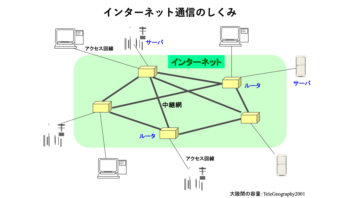 鈴木: 1990年にようやくWWW(ワールド・ワイド・ウェッブ)の仕組みが出てきた。つい30年ちょっと前のことだ。日本はウインドウズ95で、インターネットが爆発的に広がった。基本的に使っているものは光ファイバー、電線、無線通信、あるいはそこにルーター、サーバーがつながっている。学術あるいは軍のネットワークから日常生活のインフラに転換した。インターネット以前の仕組みは電話だった。それぞれ電話をすると、その都市内の交換局に行く。例えば国分寺市の交換局が大阪に通信し、大阪の高槻市の利用者に電話が入る。順番に回線を辿り通信がいく。東北の例をあげると加入者の方が古河市の電話局を通じて仙台に上げて、仙台から東京に行く。こうした回線を取っていく仕組みが日本全国にある。局番が振られていて、北海道はゼロ1から始まる。東北は02から始まる。 東京は03、04は関東、05号は東海、06は大阪、07は中国地方、09は九州のように番号が土地に応じて振られている。最近、電話による詐欺が起こっている。電話番号が地元の交換局についているので、物理的にお金を取りに行くには、その地域でやらざるを得ない。携帯電話でやるとどこにいるか分からず電話が北海道につながったりするのでお金を取りに行けない。必ず地域ごとに発生するのは固定電話を使うからだ。自宅の地元警察から、「防犯のために固定電話は留守番電話に設定してください」と言われる。「私はこの電話をつける仕事をずっとやってきた」と思わず言いたくなるが、言えずに留守番電話に切り替えて通じないようにしている。固定通信の仕組みは、地域割りになっている。 携帯電話も全国どこでも動けるようになるが、一応その地域の移動通信局があり、そこから通じている。 例えば北海道だと札幌の基地局から光ファイバーで東京まで行き、東京の基地局から個人のところに無線でいき電話をし合う仕組みだ。
