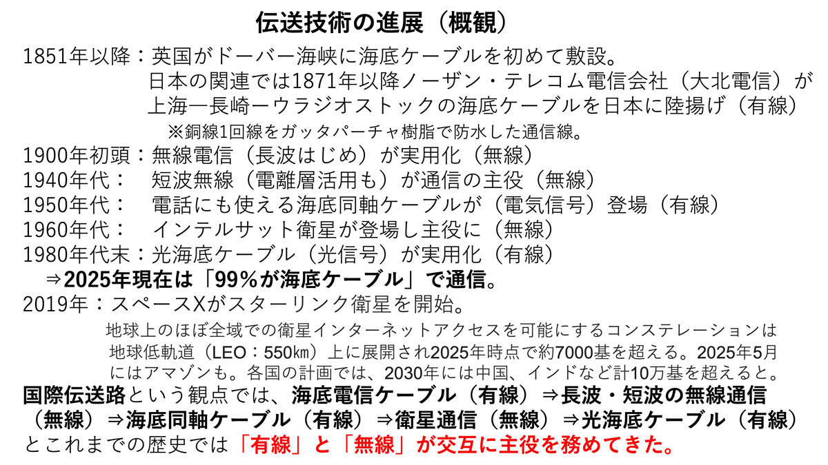 様々な通信方式が起こったが、最初は銅線1本だった。マレーシアで見つかったゴムの樹脂のようなものを銅線の周りに巻き海底に沈めると水が入ってこない。それに回線を張って信号を送る。1分間に20文字送れればいい方だ。非常に貴重で、暗号で取り決め通信をやれば通信料が安くなり、非常に便利だったのが有線の歴史だ。無線、有線、衛星、光ケーブルと、いろいろな変遷をたどってきた。