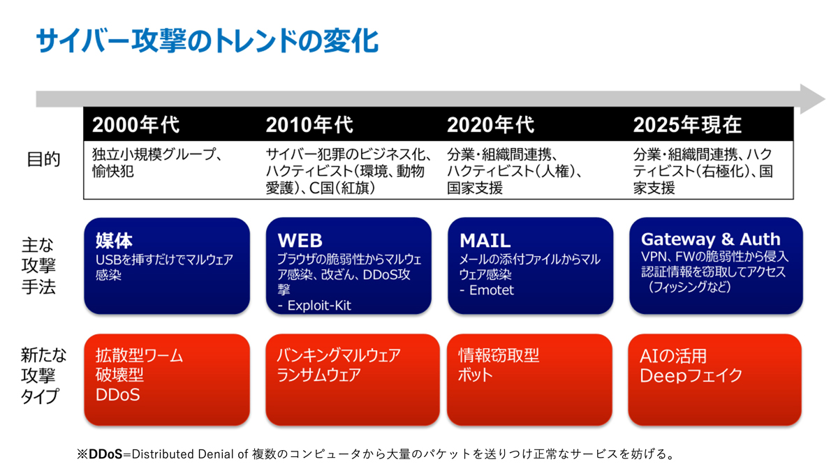 一企業からすると毎回起こるわけではないが、社会全体とすると結構な件数だ。サイバー攻撃が進化している。最初は 環境団体がどこかを訴える、或いは中国を攻撃するなどが多かったが、最近は人権侵害、攻撃の右傾化が目立つ。フェイク事件もAIを使った攻撃も多い。少し前はロボットが様々なものを分散する通信が多かったがだいぶ変わってきた。これらが丸ごと起こり ディスコードもランサムウェアもある。