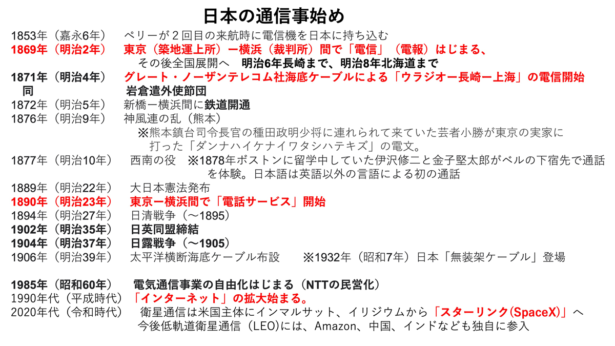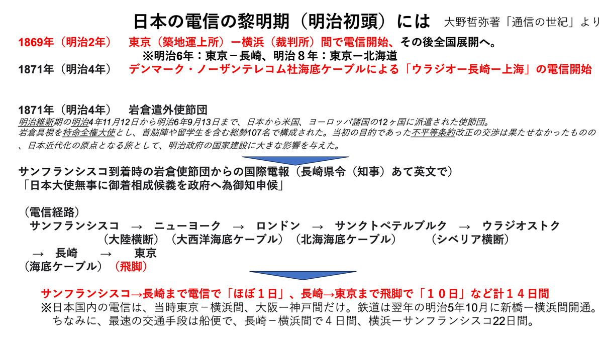 通信の歴史はこの150年、インターネットはこの30年で劇的に変わった。150年前の時間と今とは、時間単位が全く違う。岩倉使節団は明治4年、不平等条約を直す手はじめにするため、あるいは欧米の各国の現場を調べるため、日本から52人が船に乗り、120日間で世界を一周してきた。岩倉がサンフランシスコに船が着き、東京の政府に無事にサンフランシスコに着いたと知らせることになった。長崎県知事に向けて日本政府に知らせてくれとの文章を電信で打った。当時は太平洋ケーブルがないので、実はサンフランシスコからニューヨークまでアメリカの陸路を横断して電報を打った。ニューヨークから海底ケーブルでロンドンへ行き、ロンドンから海底ケーブルでロシアのサンクトペテルブルグ、当時のロマノフ王朝の首都に行ってそれからシベリアをイルクーツクからウラジオストックを出て長崎へ行ったので、長崎県知事に送ることになった。この長崎知事宛への電信が一日で来た。ところが長崎から飛脚で東京まで10日間かかった。翻訳をしなければならないから合計14日かかって東京に行き、「サンフランシスコに無事到着した」との知らせが届いた。ネットワーク自体はノーザンテレコム社のネットワークを通じて行っているが、日本はそれくらいの遅れ、ギャップがあって、長崎などの海底線のおかげで、ようやく連絡がついた。飛脚で行ったのが明治の実情だ。そこからたどたどしく開発が始まった。日本の最初の国際通信は、デンマークの会社が日本との通信をやったことに始まる。