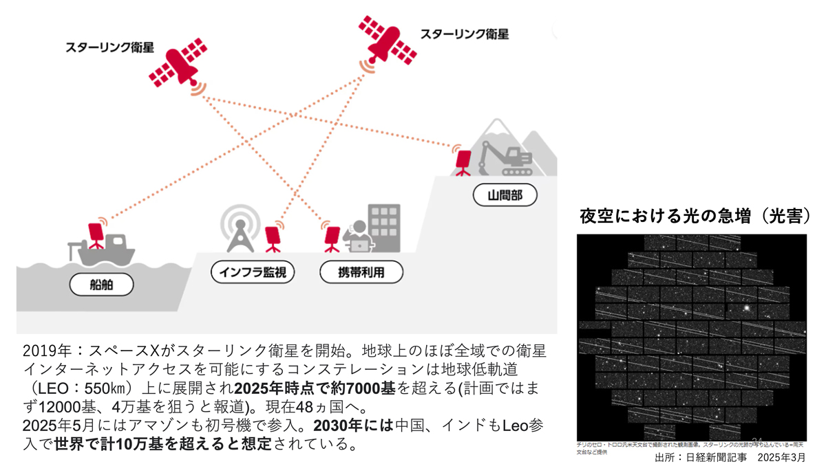 Amazonも独自に衛星を打ち上げた。1つのロケットに60個ぐらいの衛星を載せ一度に打ち上げ宇宙空間にばらまいている。中国もインドも2030年までにやると言われている。2030年を予測計算すると大体10万機ぐらい上がっているのではないか。今は7000基にならずまだ5,000基ぐらいと思うが日経新聞に載った図を見ると、夜空に衛星の軌道がピュンピュン飛んでいる。これが10万機になるとどんな夜空になるだろうと思う。iPhoneの15、16、17は直接通信する機能が載っている。これからはその510キロの衛星であれば動画はゆっくりになるかもしれないが、ファイルだったら自由に直接できるようになる。