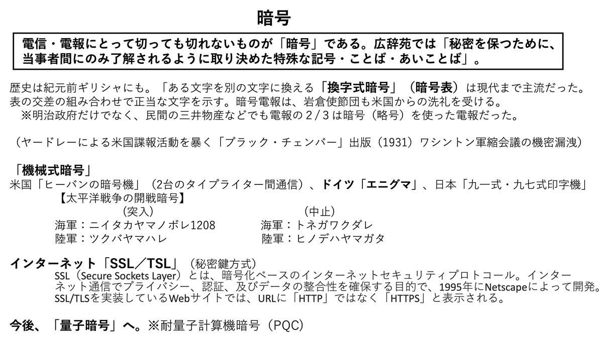 電信にとって切っても切れないのは暗号だ。暗号表を使い、いろいろなことが起こっている。岩倉具視対外使節団の時も世界のこの動きを認識したが、第二次大戦の時もそうだった。一方のタイプライターで打つと、他方のタイプライターには暗号化された情報が出てくる。それを送り合うので第三者が見ても分からない機械式暗号だ。