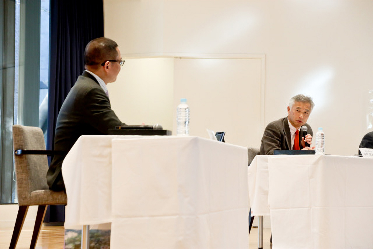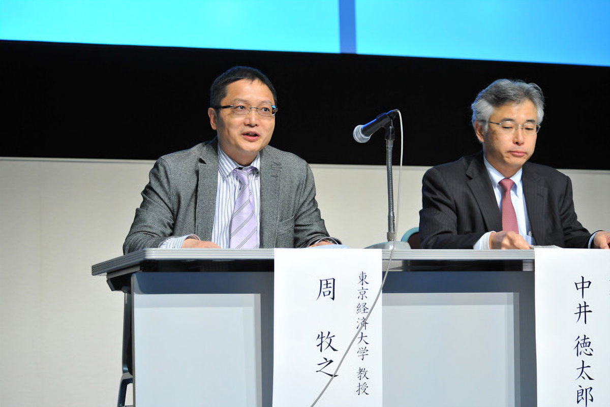 講義を行う鈴木正俊 ミライト・ホールディングス元社長(左)と周牧之 東京経済大学教授(右)