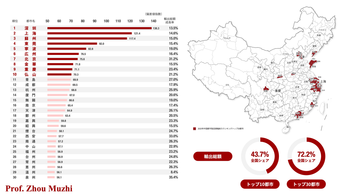 [3] 本稿で中国の分析は、データシステム『中国都市総合発展指標』を活用する。同指標は、雲河都市研究院と中国国家発展改革委員会発展戦略和計画司(局)が共同開発した都市評価指標である。2016年以来毎年、内外で発表してきた同指標は、環境・社会・経済という3つの軸(大項目)で中国の都市発展を総合的に評価している。評価対象は、中国297地級市以上都市(日本の都道府県に相当)全てをカバーし、評価基礎データは882個に及ぶ。『中国都市総合発展指標』は2016年以来毎年、中国都市ランキングを内外で発表してきた。同指標は環境・社会・経済という3つの軸(大項目)で中国の都市発展を総合的に評価している。同指標の構造は、各大項目の下に3つの中項目があり、各中項目の下に3つの小項目を設けた「3×3×3構造」で、各小項目は複数の指標で構成される。これらの指標は、合計882の基礎データから成り、内訳は31%が統計データ、35%が衛星リモートセンシングデータ、34%がインターネットビッグデータである。その意味で、同指標は、異分野のデータ資源を活用し、「五感」で都市を高度に知覚・判断できる先進的なマルチモーダル指標システムである。現在、中国語(『中国城市総合発展指標』人民出版社)、日本語(『中国都市ランキング』NTT出版)、英語版(『China Integrated City Index』Pace University Press)が書籍として出版されている。『中国都市総合発展指標』について詳しくは、周牧之ら編著『環境・経済・社会 中国都市ランキング2018―大都市圏発展戦略』、NTT出版、2020年10月10日を参照。